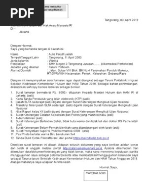 Berdasarkan surat menteri pendayagunaan aparatur negara dan reformasi birokrasi nomor b/304/m.sm.01.00/2020 tanggal 16 maret 2020 tentang persetujuan prinsip tambahan kebutuhan cpns dari siswa/siswi poltekip/poltekim tahun anggaran 2020, kementerian hukum dan hak asasi manusia republik indonesia mengundang putra dan putri terbaik lulusan sekolah lanjutan tingkat atas sederajat dan pegawai. surat pernyataan belum pernah memiliki akta kelahiran contoh seputar surat. surat lamaran kerja adalah sebuat surat yang dibuat untuk keperluan permohonan bergabung atau bekerja di sebuah perusahaan dengan posisi atau jabatan sesusai dengan apa yang dibutuhkan oleh perusahan penyedia lowongan kerja. Sekretaris jenderal kementerian hukum dan hak asasi manusia (kemenkumham) telah menerbitkan pengumuman tentang seleksi calon taruna taruni poltekip dan poltekim kemenkumham tahun 2021. Ijasah (asli) akte lahir / surat keterangan lahir (asli) surat keterangan belum menikah dari lurah/kepala desa (asli) surat pernyataan 6 poin;
